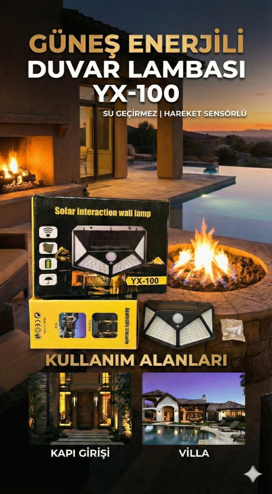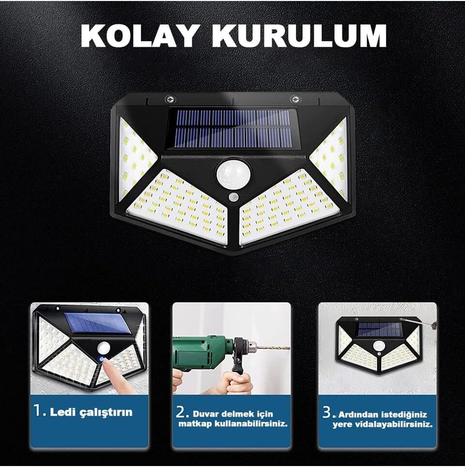 100 LED güneş lambası :dış mekan güneş lambası, mükemmel aydınlatma sağlayan 100 ultra-parlak LED boncuk ile donatılmıştır. Lamba doğrudan güneş ışığında 8-12 saat şarj edilebilir ve verilen vida ile monte edilebilir.