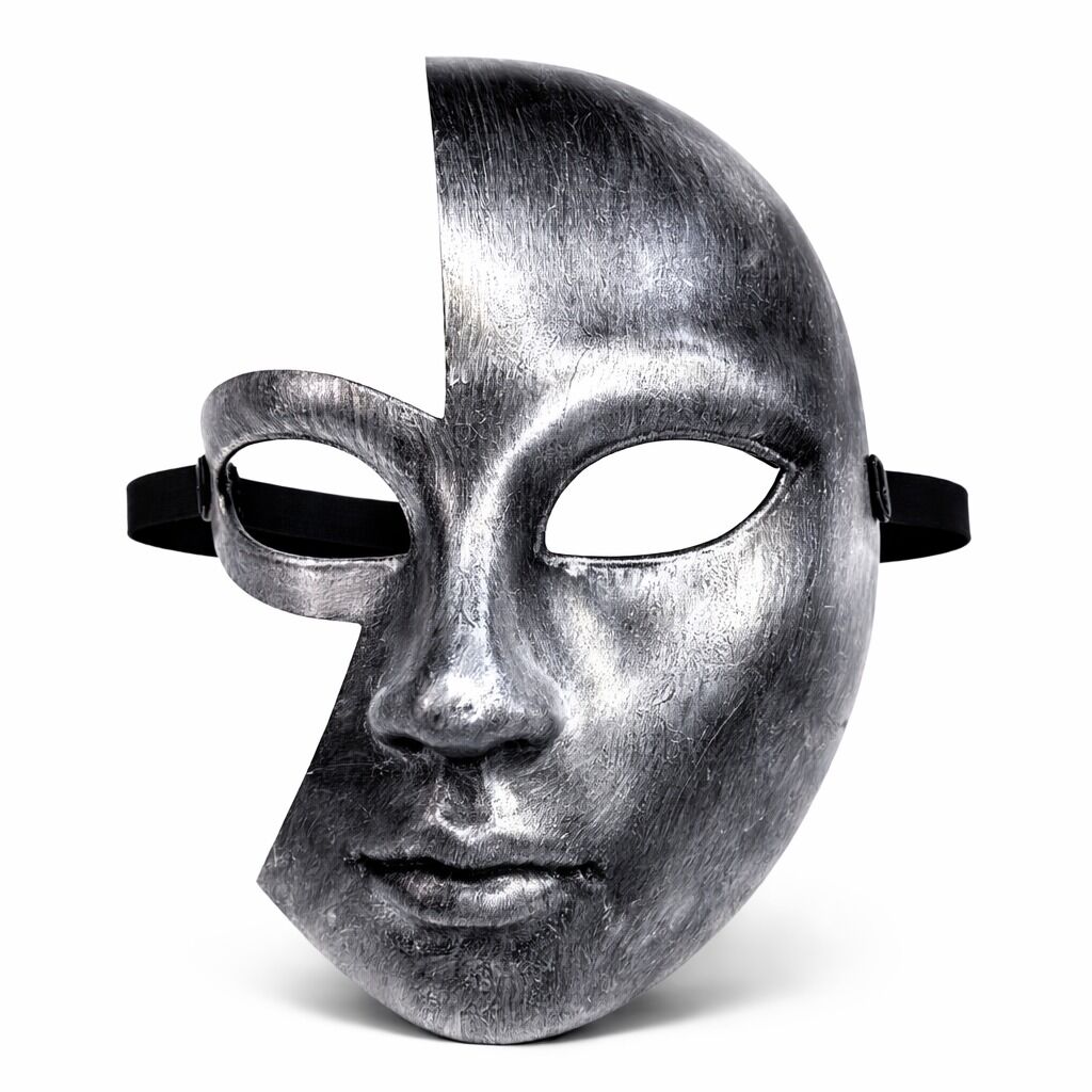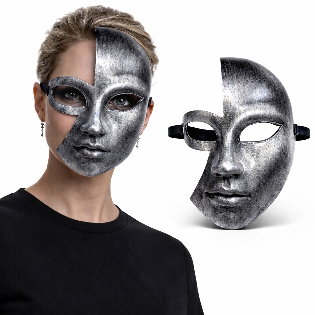 Antik efektli gümüş yarım yüz maskesi ile gizemli ve güçlü bir stil oluşturun. Metalik görünümlü özel yüzeyi, eskitme dokusu ve detaylı yüz formu sayesinde dikkat çekici bir görünüm sunar.
