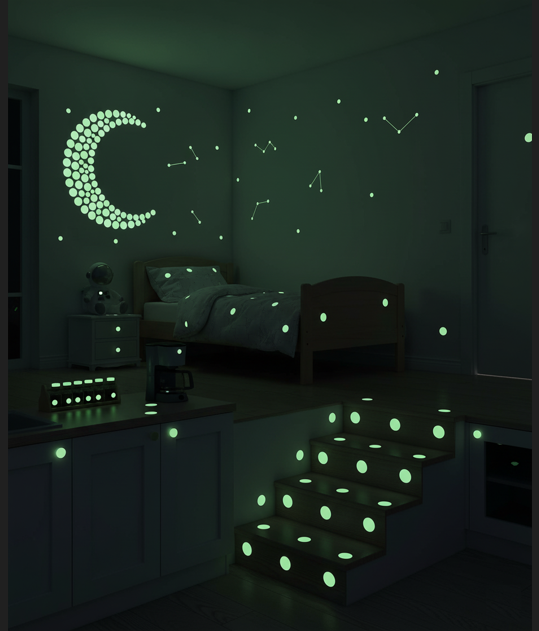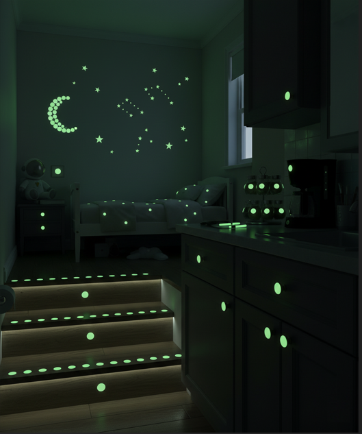 Fosforlu Etiket Karanlıkta Işık Veren Yıldız Tozu Etiketleri ile artık karanlıkta kaybolan eşyalara ve tehlikeli köşelere veda edin. Gün ışığını veya yapay ışığı hızlıca emerek karanlıkta saatlerce parlayan bu dev set, evinizin dekorasyonuna sihirli bir dokunuş katarken aynı zamanda güvenliği de artırır.