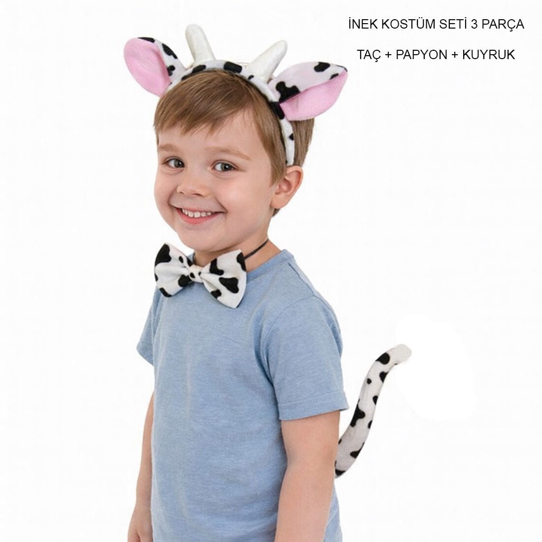 İnek Kostüm Seti 3 Parça, çocukların okul gösterilerinde, sahne performanslarında ve hayvan temalı etkinliklerde keyifle kullanabileceği sevimli ve hafif bir kostüm setidir.