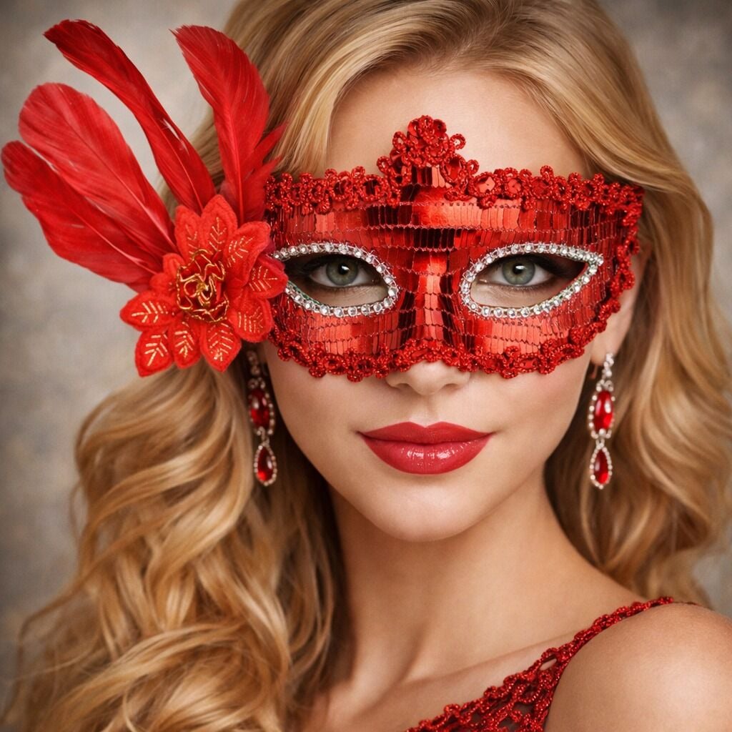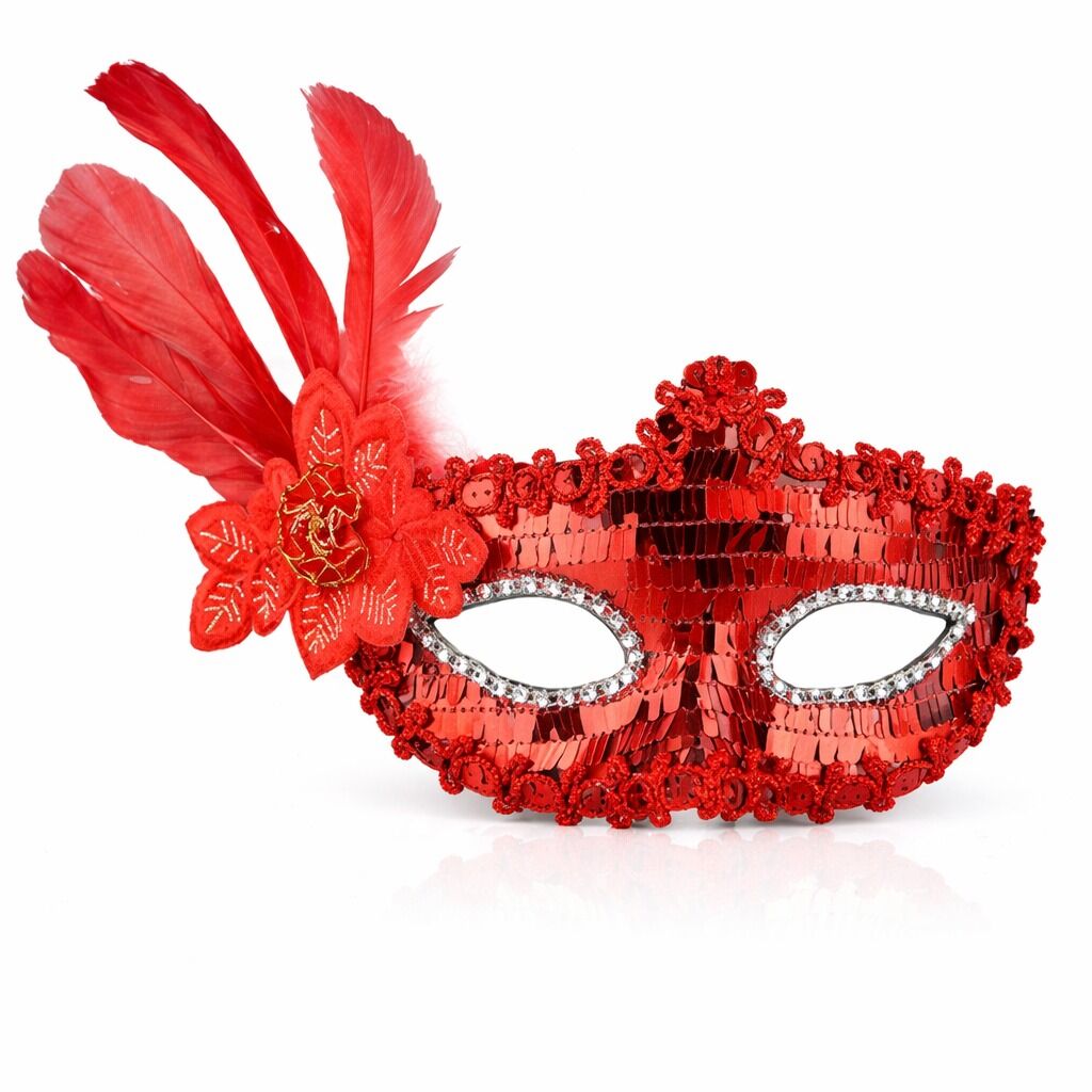 Partilerin yıldızı olmak ister misiniz? O halde kırmızı renk yandan tüylü payetli parti maskemiz tam size göre!