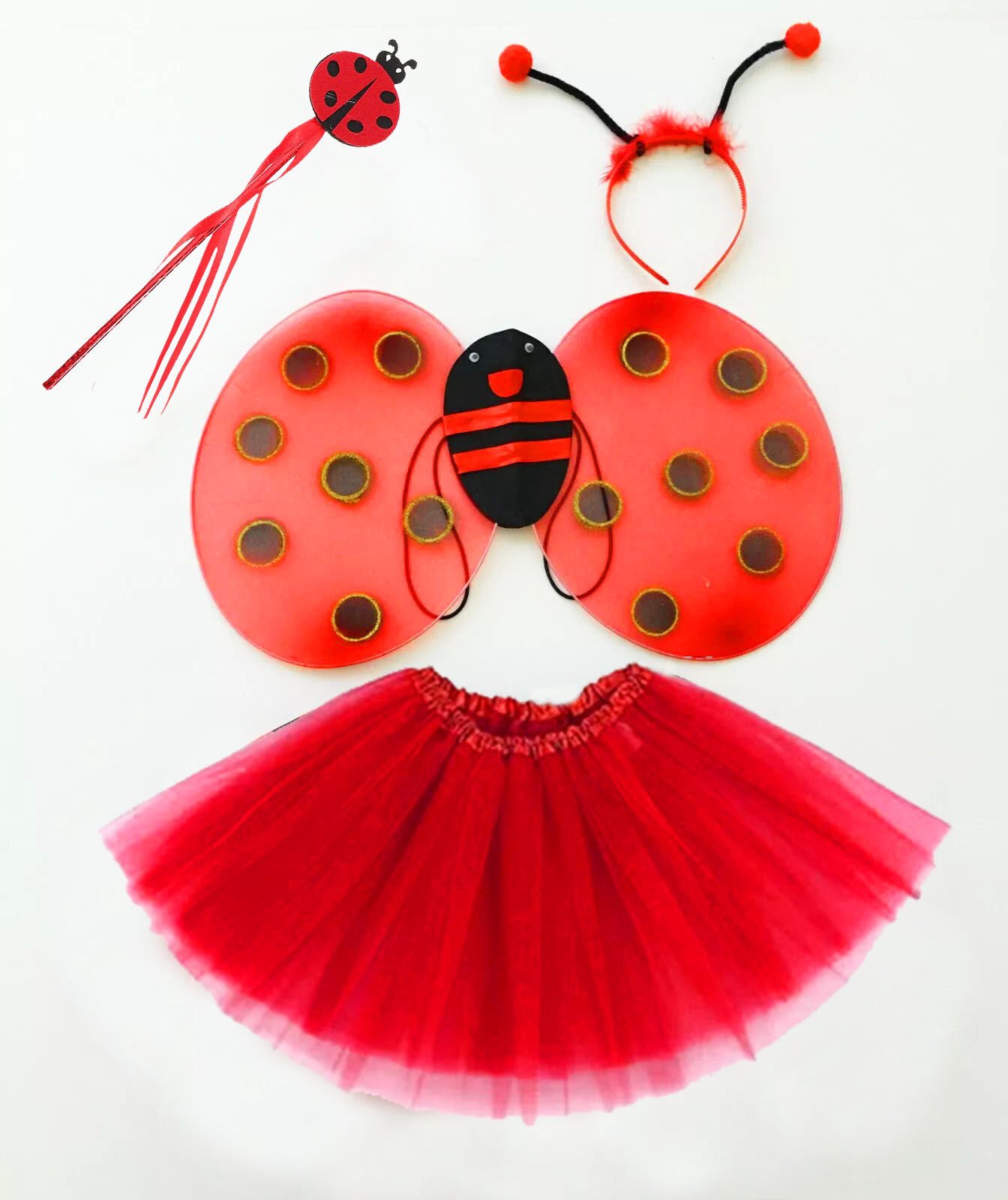 - Canlı kırmızı veya siyah renklerde, uğur böceği veya ateş böceği desenleriyle süslenmiş kanatlar, kostüme gerçekçilik katar.