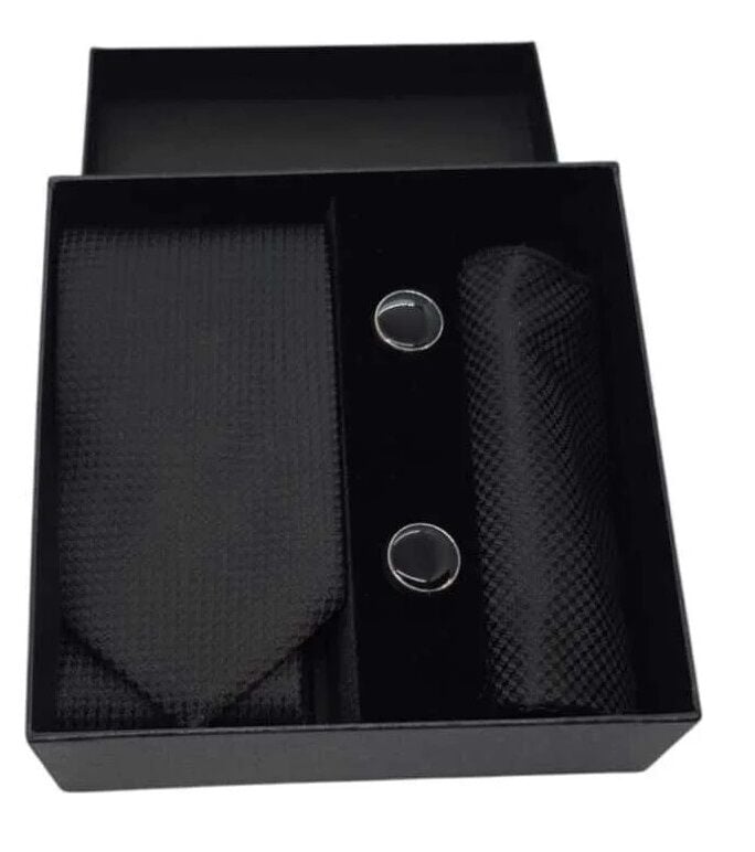 Kravat Düğme Set Siyah Desenli Kravat Mendil Kol Düğmesi Özel Set