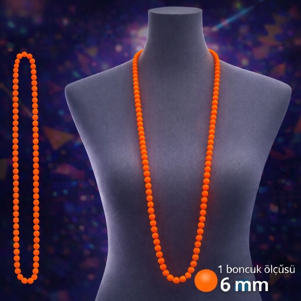 Enerjik ve dikkat çekici bir stil arıyorsan neon turuncu boncuk kolye tam sana göre! 80’ler ve 90’ların ikonik parti ruhunu yansıtan bu uzun model kolye, neon rengi sayesinde ortamda anında fark edilir.