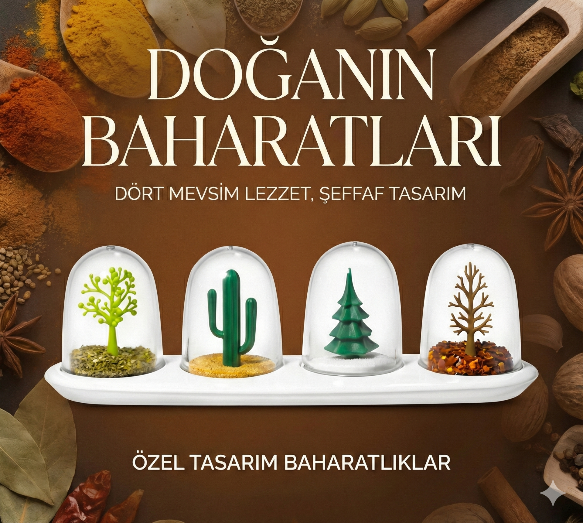 4 mevsimi sofranızda yaşatan harika bir baharatlık. Her birinin içinde uygun mevsime göre ağaç figürleri bulunur ve uygun baharat kullanıldığında gerçekçi bir görüntü elde edilebilir!