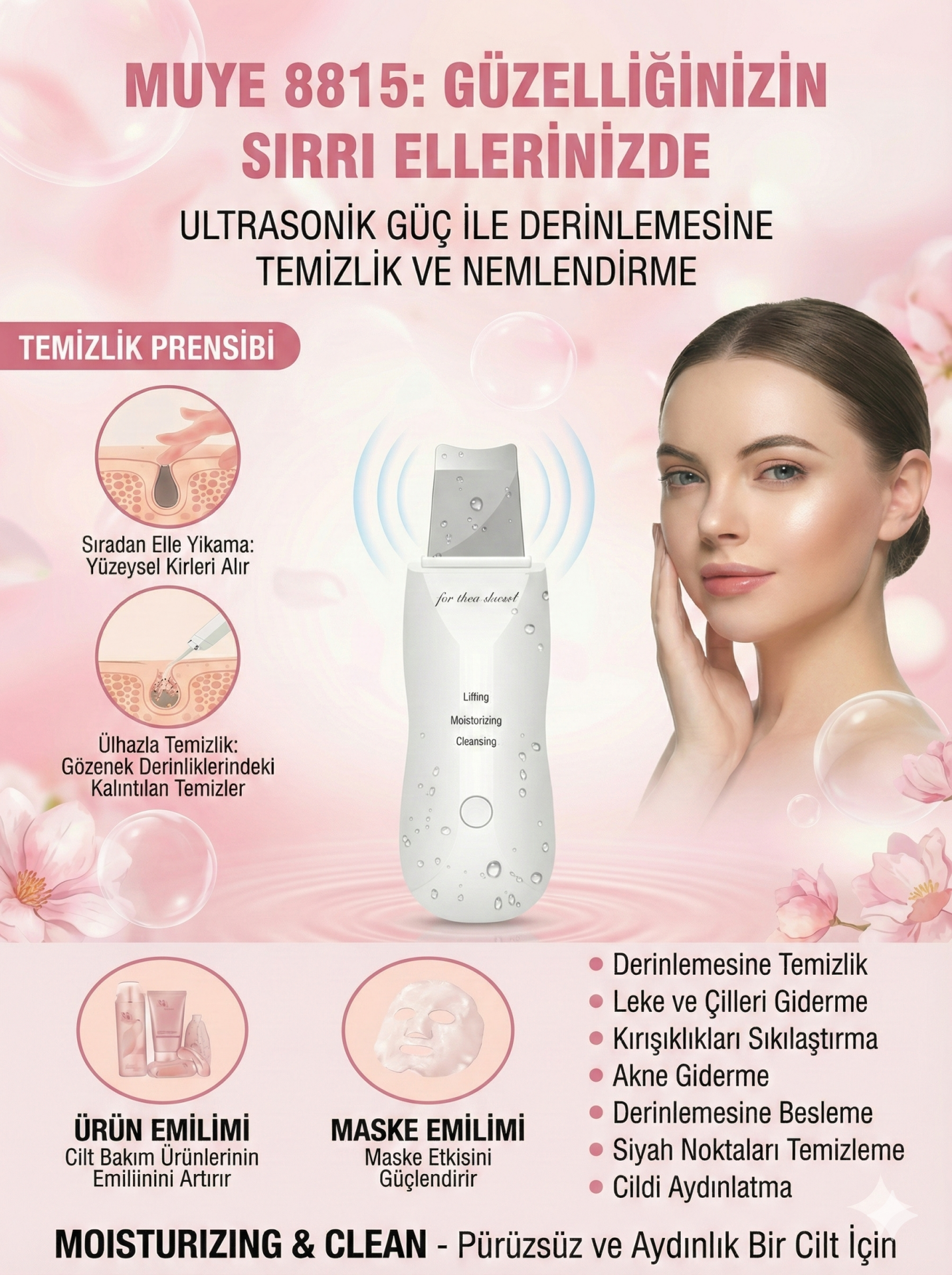 - Lifting: Cilt Soyma Moisturizing: Cilt Nemlendirici Cleansing: Cilt Temizleme Kullanım: Yüzünüzü Suyla Temizleyin Yüzünüzü ıslak tutun ve ovalayın soyma moduna geçin, ovalama makinesini spatula bıçağı aşağı bakacak şekilde tutun, spatulanın kenarını cilt yüzeyi boyunca hafifçe kaydırın, gözeneklerden kolayca toparladığını izleyin spatulun kenarına taşar