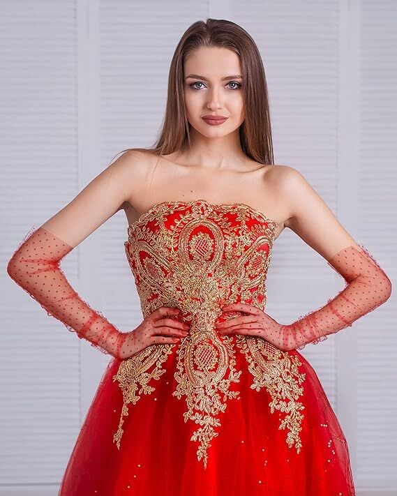 Uzun Boy Kırmızı Puantiyeli Kırmızı Renk Tül Eldiven