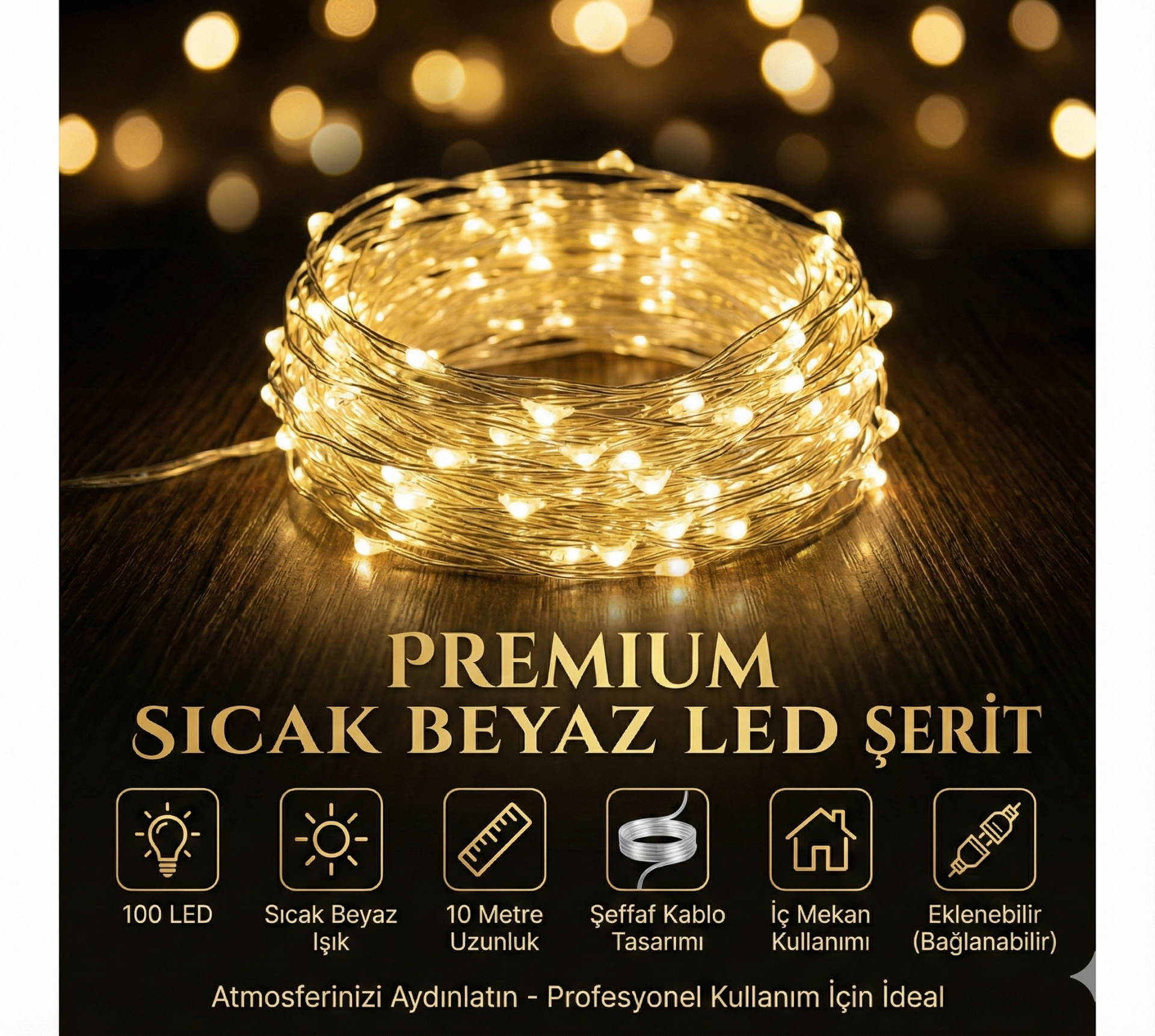 Sıcak beyaz ışık veren perde hortum, 10 metre uzunluğunda olup şeffaf kablo tasarımıyla estetik bir görünüm sunar.
